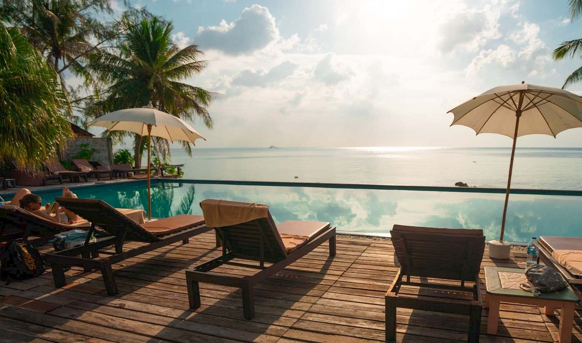 A serene beach scene with sun loungers, umbrellas, and a view of the ocean under a partly cloudy sky at sunset.
