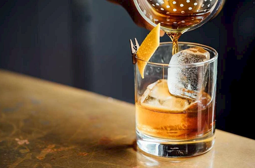 A cocktail being poured into a glass with ice and a citrus twist garnish, set on a bar counter.